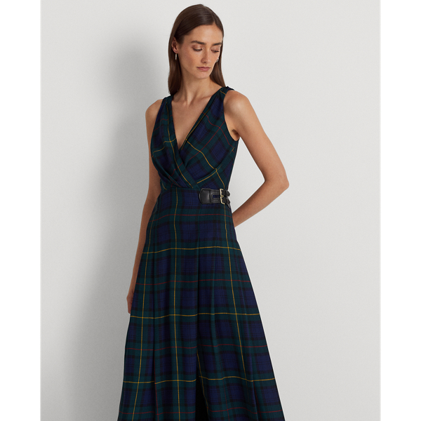 Plaid Belted Cotton-Blend Shirtdress. Foil-Print Jersey Cocktail Dress. RL Vachetta Leather Belt.